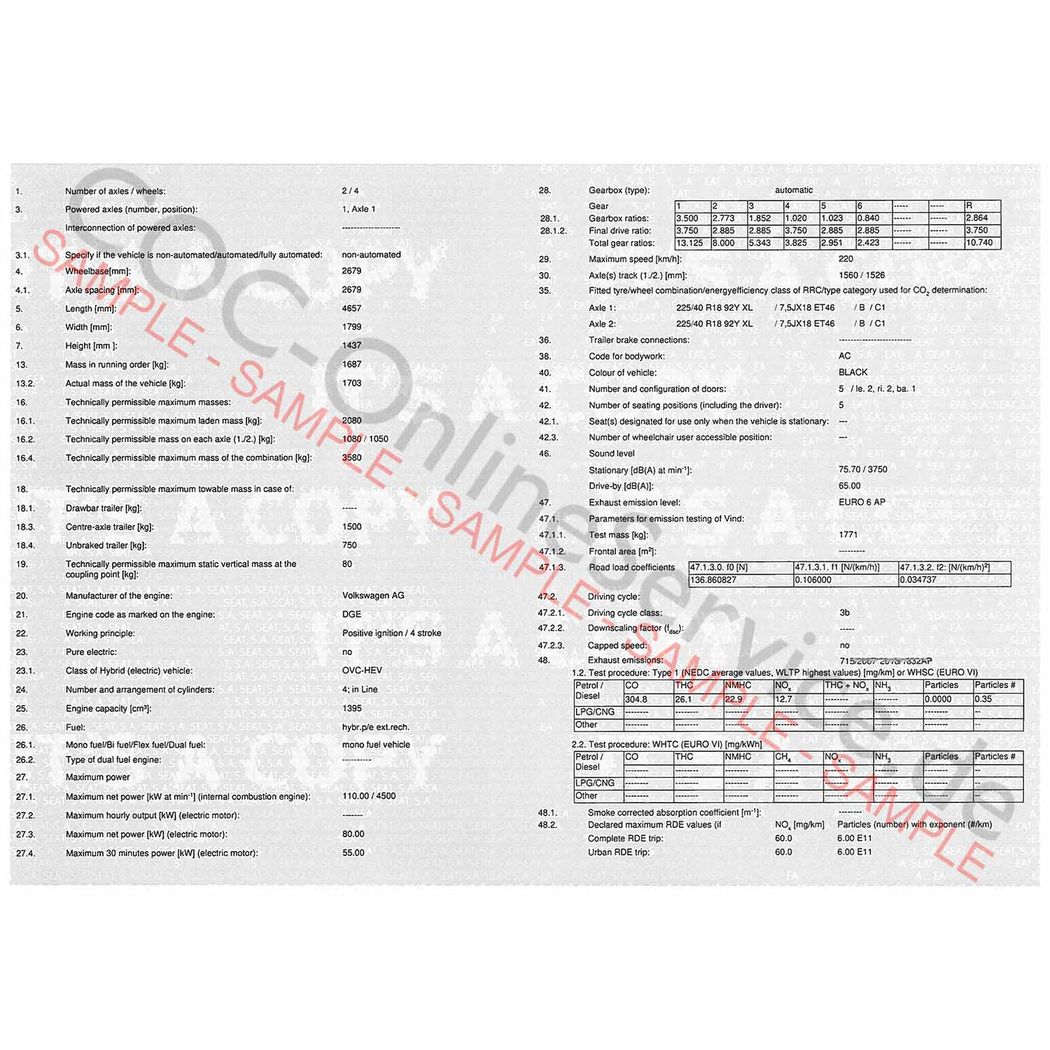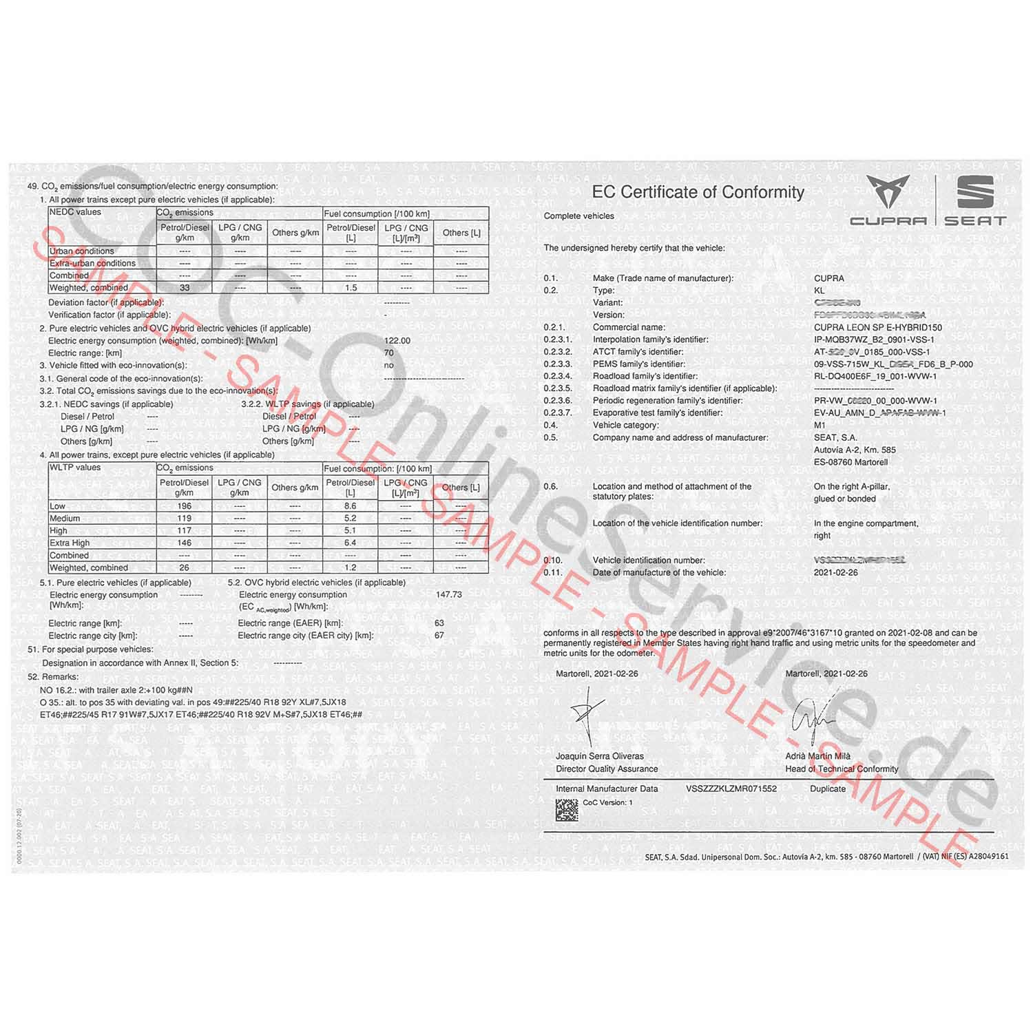 COC-dokumenter til Cupra (Certificate of Conformity)
