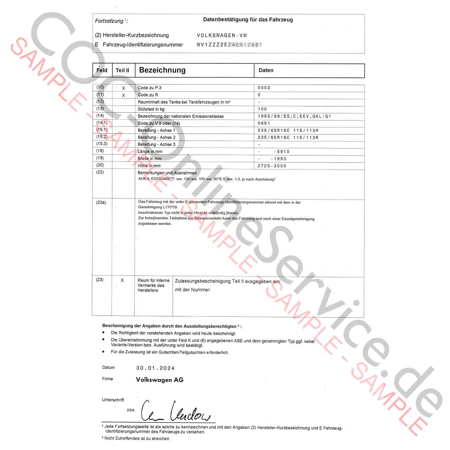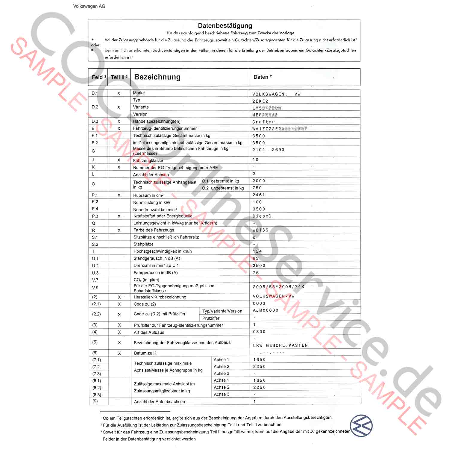 Dit gegevensblad voor de Volkswagen personen- en bedrijfswagenmerken is bedoeld ter ondersteuning van de registratie in Duitsland als het voertuig geen EG-typegoedkeuring heeft en er geen COC kan worden aangemaakt.