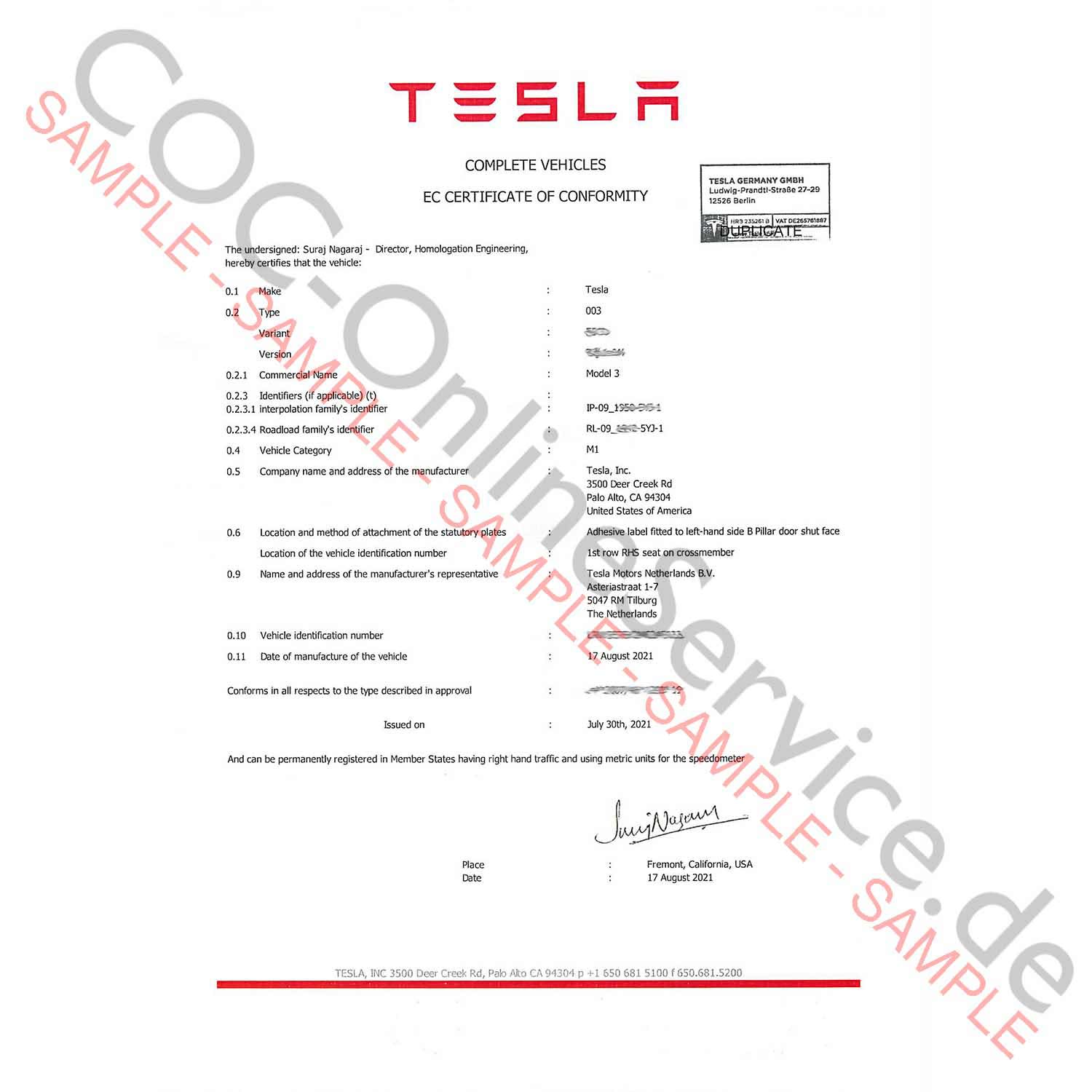 COC dokumenty pre Tesla (Certificate of Conformity)